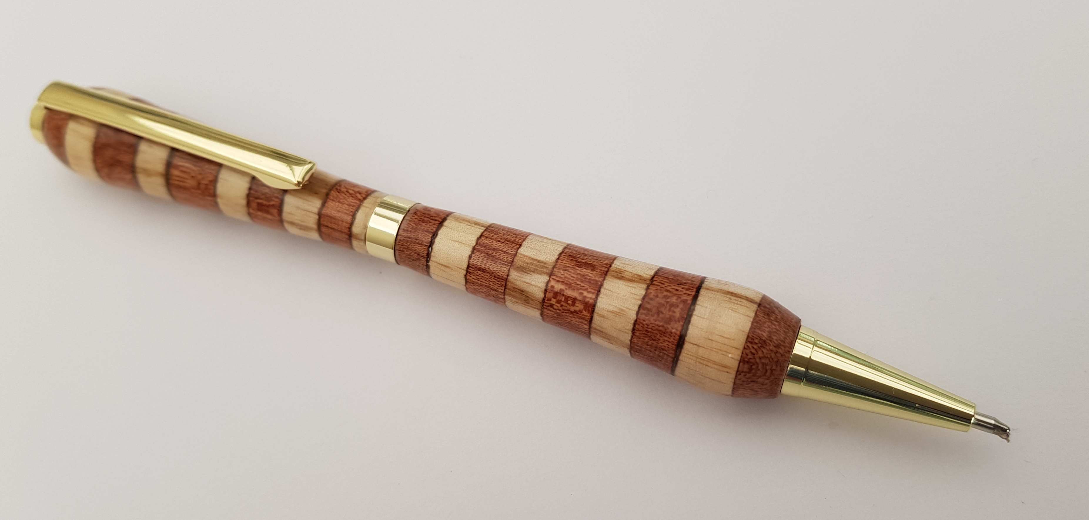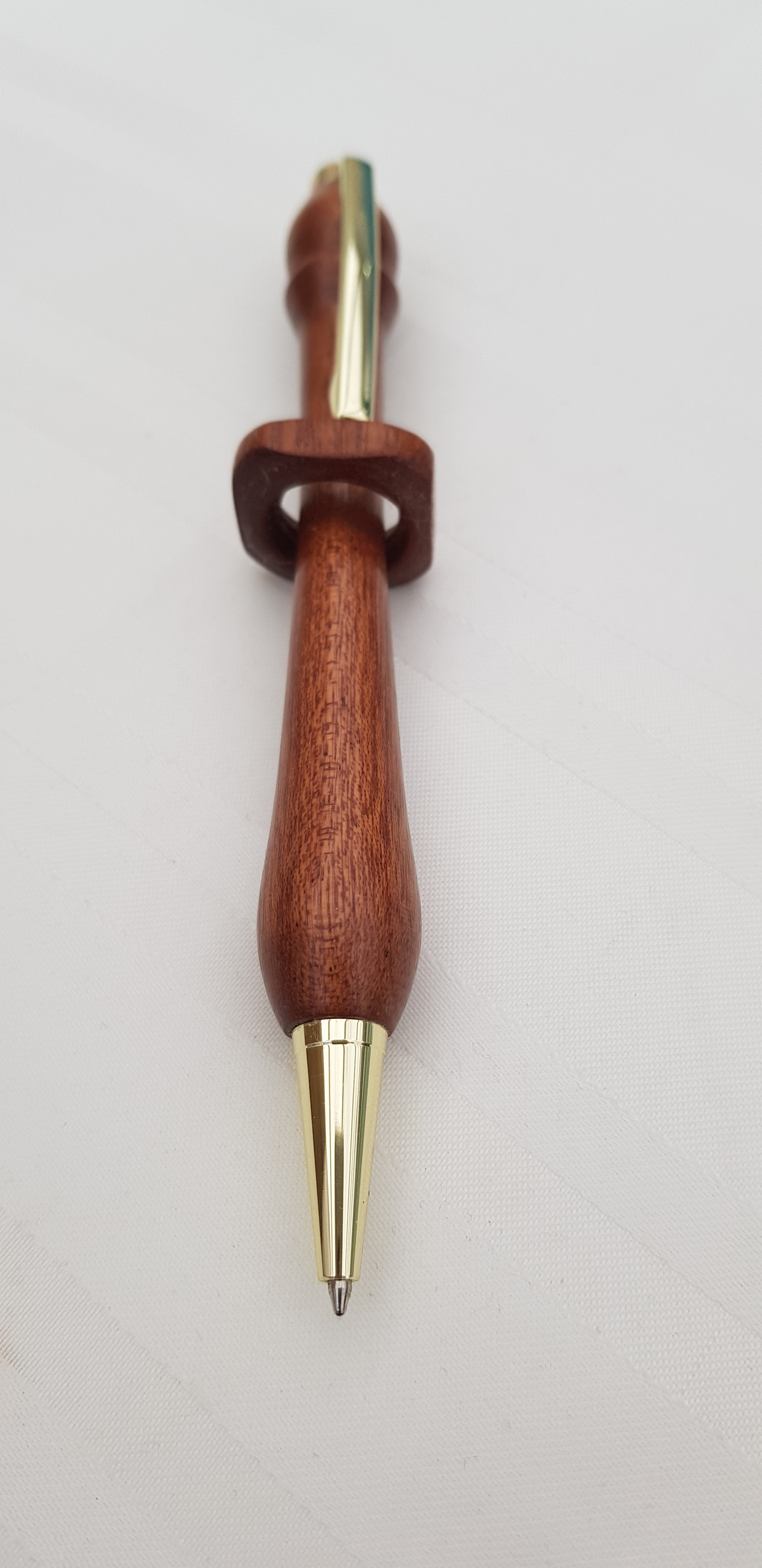 Here I have a closely grained turned pen in Meranti timber. It is unusual as I have included a squared captive ring. The trim (nib and pen clip) is in a gold colour and is finished using carnauba wax to provide a protective surface.