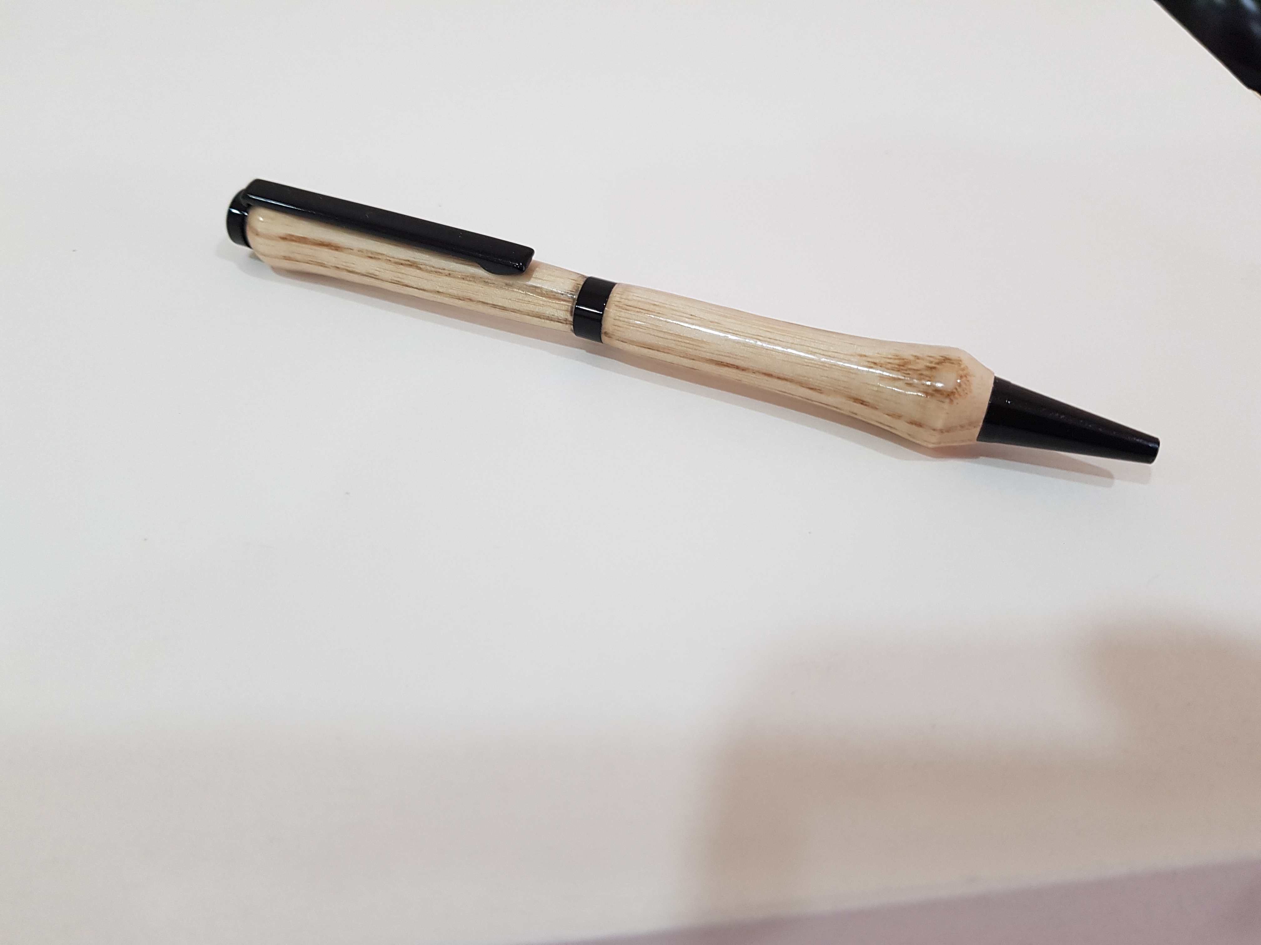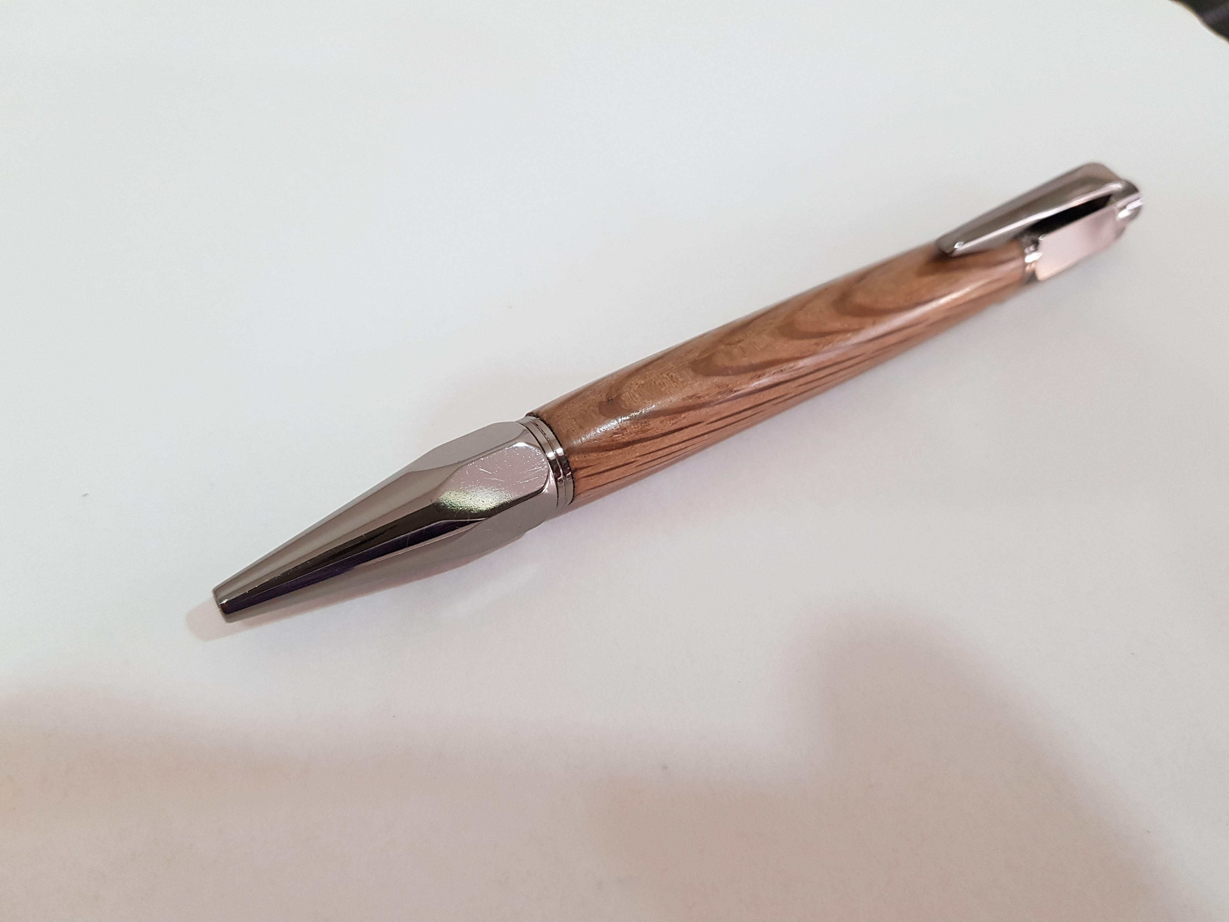 This is a uniquely shaped ballpoint pen made from end-grain olive wood. It uses a twist at the centre band to expose the writing nib and, it was made without a pen clip so that it can be carried in a pocket or handbag. The photo doesn’t really show off its rather nice grain pattern.